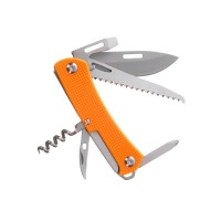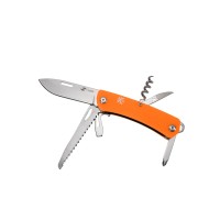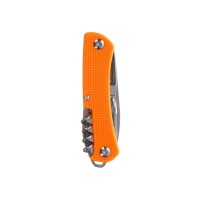 Нож перочинный STINGER имеет 10 функций:1. Лезвие2. Пила по дереву3. Открывалка для бутылок с:4. – Отверткой5. – Инструментом для снятия изоляции6. Штопор7. Шило с:8. – Иглой9. Крестовая отвертка10. Держатель для ключейХАРАКТЕРИСТИКИМатериалы• лезвие/инструменты: нержавеющая сталь 440A, твердость 54-58 HRC• рукоять: нержавеющая сталь 440A, твердость 54-58 HRC• накладки рукояти: АБС-пластикРазмеры• Размеры ножа: 103х28х19 мм• Общая длина: 175,5 мм• Длина клинка: 72,3 мм• Наибольшая ширина клинка: 19,7 мм• Толщина обуха: 2,2 мм• Длина рукояти: 103,2 мм• Ширина рукояти (в ср.части): 20,8 мм• Толщина рукояти (в ср.части): 15,8 ммВес: 147 гЦвет накладок рукояти: оранжевыйНакладки рукояти ножа не подлежат замене.Упаковка: картонная коробка