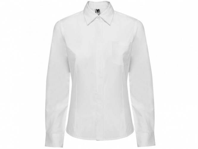 Рубашка женская прилегающего силуэта с вытачками на полочке и спинке с коротким рукавом. Накладной карман на груди слева, закругленный низ изделия. Планка с потайными пуговицами.