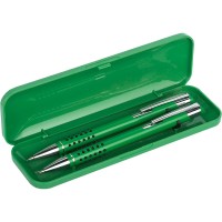 Набор письменных принадлежностей, состоящий из шариковой ручки с нажимным механизмом и механического карандаша, предлагается в компактном пластиковом футляре. На ручку, карандаш и футляр можно нанести логотип и подарить в качестве сувенира или небольшого презента клиенту компании.