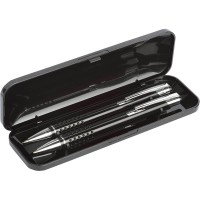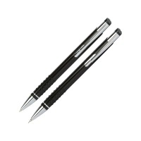 Набор письменных принадлежностей, состоящий из шариковой ручки с нажимным механизмом и механического карандаша, предлагается в компактном пластиковом футляре. На ручку, карандаш и футляр можно нанести логотип и подарить в качестве сувенира или небольшого презента клиенту компании.