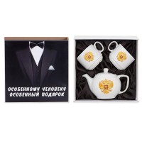 Подарочный набор чайных кружек с фарфоровый чайником Виват, Россия! Фарфоровый чайник и две фарфоровые чайные кружки с чеканным металлическим декором «Двуглавый орел». Накладка изготовлена из алюминия методом чеканки с декоративной отделкой «под золото». Ёмкость чашек 220 мл., ёмкость чайника 400 мл. Ручная работа.