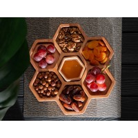 Менажница выполнена в виде семи сот для разных видов закусок — за бонусную дополнительную отвечает съемная сота-соусница, в которую можно залить мед или любимый соус.Менажница выполнена из бука и пропитана маслом, что обеспечивает изделию свежий вид. Советуем регулярно смазывать дерево пищевым маслом, чтобы изделие дольше радовало вас.- натуральный бук- съемная соусница - интересный дизайн - вариант для подачи 8 видов закусок- можно использовать для сервировки закусок