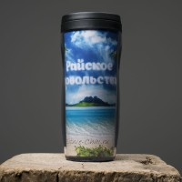 Отличный рекламоноситель с огромным полем печати — можно разместить не просто логотип, а целую историю. Полноцветная вставка занимает всю поверхность стакана и смотрится очень органично. Для сборки и разборки не требуются клей или специальные инструменты — изображение помещают в пространство между внешним и внутренним слоями корпуса, части которого скрепляют с помощью скрытого в дне стакана резьбового соединения.