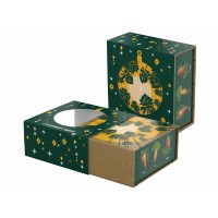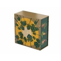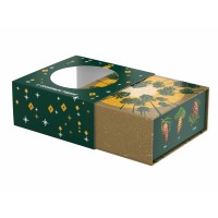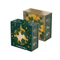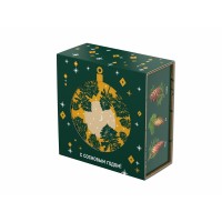 Аромат и вид хвои – символ Рождества и Нового года. «Хвойная» шкатулка «С сосновым годом!» оформлена праздничным паттерном и изображением шишек разных хвойных деревьев. На крышке шкатулки помещена иллюстрация, изображающая вид снизу вверх на звёздное небо и уходящие ввысь сосны. При надевании на шкатулку шубера (суперобложки) с круглым отверстием, на крышке шкатулки появляется вырубное изображение новогоднего шарика.Состав:Варенье из шишек (40г): шишки сосновые, сахар, вода.Чай с пихтой и ягодами можжевельника (50г): черный чай, хвоя пихты, ягоды можжевельника.Пастила с кедровыми орешками (50г): яблоко, яичный белок, кедровые орехи.Миндаль в шоколадной глазури (40г): шоколадная глазурь (сахар-песок, эквивалент какао-масла, эмульгаторы, антиокислитель (Е306), какао порошок эмульгатор (Е476), аромативатор «Ванилин», миндаль, сахарная пудра, масло какао, глазирователь.