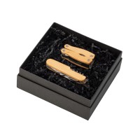 Набор состоит из двух предметов:Мультитул-нож для повседневных нужд (состоит из открывалок для банок и бутылок, плоской отвертки, пилки, штопора, ножа и ножниц);Мультитул-плоскогубцы для ремонта (состоит из плоскогубцев, открывалок для бутылок и банок, крестовой и 3-х плоских отверток, ножа, пилы по дереву и напильников по дереву и металлу).Оба мультиинструмента сочетают в себе текстуры металла и теплого натурального бамбука, благодаря чему хорошо ложатся в руку. • легкие и компактные мультитулы на все случаи жизни• мультитул-нож для повседневного ношения, мультитул-плоскогубцы для бытовых дел• качественные и долговечные материалы• подарочная коробка