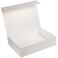Коробка выполнена из переплетного картона, кашированного гладкой дизайнерской бумагой Majestic цвета «Золотой свет», с крышкой на магнитах.
