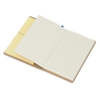 Компактный набор включает в себя разноцветные стикеры разных размеров, блокнот с линованной бумагой и ручку c корпусом из переработанного картона. Обложка выполнена из фактурной искусственной кожи, которая, при тиснении, меняет цвет на более глубокий.