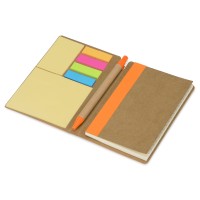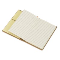 Компактный набор включает в себя разноцветные стикеры разных размеров, блокнот с линованной бумагой и ручку c корпусом из переработанного картона. Обложка выполнена из фактурной искусственной кожи, которая, при тиснении, меняет цвет на более глубокий.