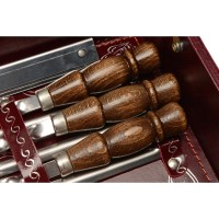 Кейс из сплит-кожи, с повышенной износостойкостью, внутренняя отделка натуральная кожа с художественным выжиганием.В комплект входит:Стопка d5,5 х 6 см - 6штТермос d7 х 25 см - 1штВилка 19,5 х 2,5 х 2 см - 6штЛожка 19,5 х 4,5 х 2,5 см - 6штВилка для барбекю 23 х 3 х 3см - 1штНож 26,5 х 4 х 2,5 см - 1штНожки для мангала 51 х 31 х 1 см - 2штШампур d3 х 65,5 см - 6штШтопор 11 х 3 х 1см - 1штНож "Проводник" 47 х 8 х 3 см - 1шт