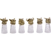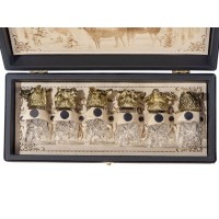 Футляр из эко-кожи, внутренняя отделка натуральная кожа молочного цвета. Рисунок нанесен путем термообработки.В набор входит шесть стопок по 50 мл. Хрусталь, литьё.