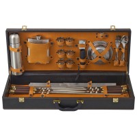 Кейс из сплит-кожи, с повышенной износостойкостью, внутренняя отделка натуральная кожа.Все аксессуары надежно крепятся к кейсу кожаными ремешками на кнопке, обеспечивая удобство транспортировки и сохранность содержимого.В комплект входит:Стопка 25 мл d4,2 х 5 см - 6штТермос 500 мл d6,9 х 24,5 см - 1штФляга 250 мл - 12,7 х 16,7 х 2,9см - 1штЗажигалка- 3,8 х 5,7 х 1,3см- 1 штФонарь- d3,4 х 11,4см- 1штВоронка- d3,7 х 2,4см- 1штТарелка- d15 х 4,5см -1штВилка 19 х 2,5 х 1,7 см - 6штЛожка 19 х 4,5 х 2,5 см - 6штНож 26 х 4,3 х 2,8 см - 1штНож Топорик- 24 х 6,8 х 2,2см - 1штНожки для мангала 50,3 х 31 х 0,9 см - 2штШампур d2,3 х 65,3 см - 6штШтопор 11 х 2,5 х 0,9см - 1шт