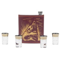 Кейс из сплит-кожи, с повышенной износостойкостью, внутренняя отделка натуральная кожа с художественным выжиганием.В комплекте:Стопка 15 мл- 4 шт.Фляга 500 мл- 1 шт.