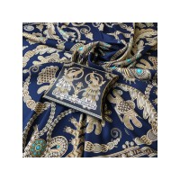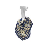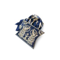 Платок «Русское золотное шитьё» посвящён драгоценному старинному русскому рукоделию. Дошедшие до нас памятники шитья, выполненные русскими мастерицами, являются произведениями высокой культуры. В изделиях сочетаются талант художника и тонкий вкус, духовное богатство, исполнительское мастерство вышивальщиц. В центре композиции излюбленный сюжет традиционного русского орнамента - царственные павлины. Они горделиво восседают в обрамлении из фантастических цветов и виноградных лоз. Павлин в русской культуре — это жар-птица, которая несет в себе солнечную энергию развития, поэтому это птица семейного счастья. Они всегда рассаживаются на свадебных рушниках. Павлин за красоту своих перьев стал символом расцвета, молодости. Про стройную, красиво одетую девушку говорят: «Будто пава плывет». Мы старались воссоздать в рисунке сложную фактуру древнего промысла, придав золотошвейному искусству новую форму. Желаем всем обладательницам платка «Русское золотное шитьё» наполниться энергией и тёплом посланий предков. А изысканная цветовая гамма платка сделает этот аксессуар незаменимым в гардеробе любой леди, неравнодушной к современной моде.Дизайн: Нина Ручкина, Наталия Александрова.