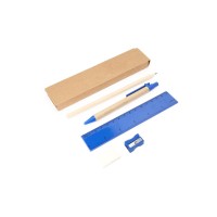 Канцелярский набор. Включает ручку с картонным корпусом и синими чернилами, деревянный карандаш, точилку для карандашей, ластик и линейку длиной 15 см.
