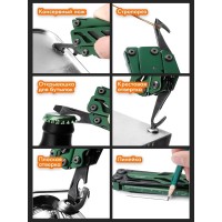 инструменты (функции) велосипедный ключ, консервный нож, кусачки, линейка, напильник, нож, ножницы, острогубцы, отвертка, открывалка для бутылок, пассатижи, пила, плоскогубцы, стеклобой, нож для стропов